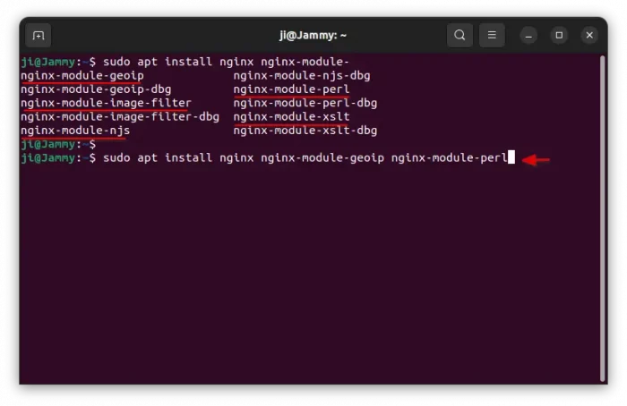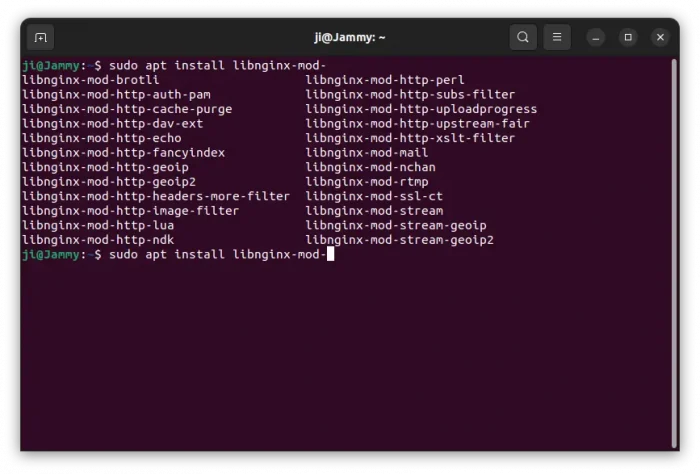 As you see in the screenshot, there’s only 5 modules available. Instead of using nginx-module-* for installing all the modules, you may replace it with specific package.