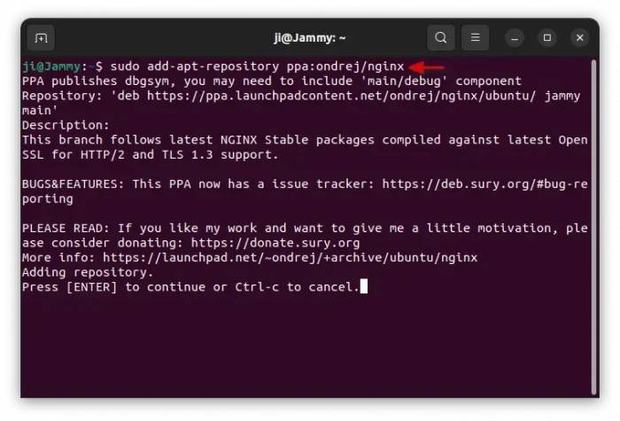 In the output, there should be a line saying “Get:x https://nginx.org/packages/ubuntu code-name InRelease”.