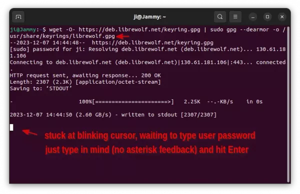 NOTE: The command MAY be stuck at blinking cursor, because ‘sudo’ needs user password authentication. Just type your password in mind (no feedback) and hit Enter to get pass.