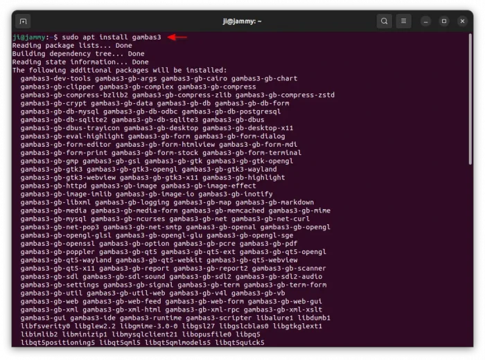 3. Finally, install Gambas, as well as the compiler, runtime interpreter, scripter, IDE, and extension components by running command: