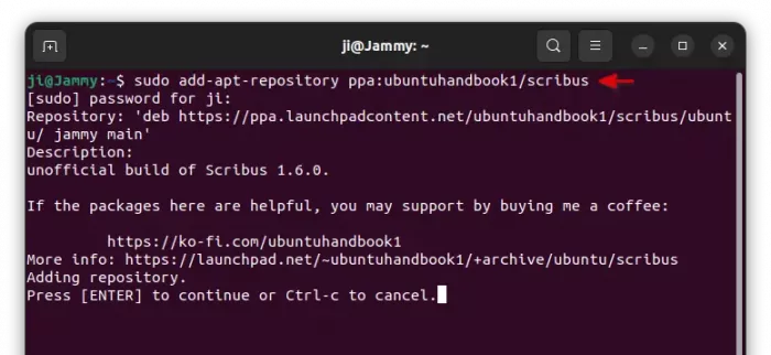 sudo add-apt-repository ppa:ubuntuhandbook1/scribus