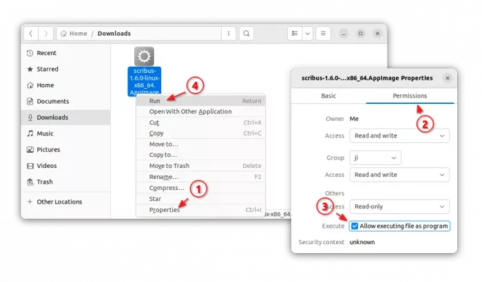 The .AppImage is non-install package, that can be run directly to launch software. However, you need to right-click on it and add ‘executable‘ permission under Properties dialog.