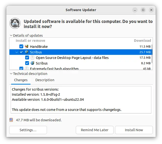 Scribus provides official Linux package through AppImage, which runs in sandbox. It’s available to download at the sourceforge page via the link below: