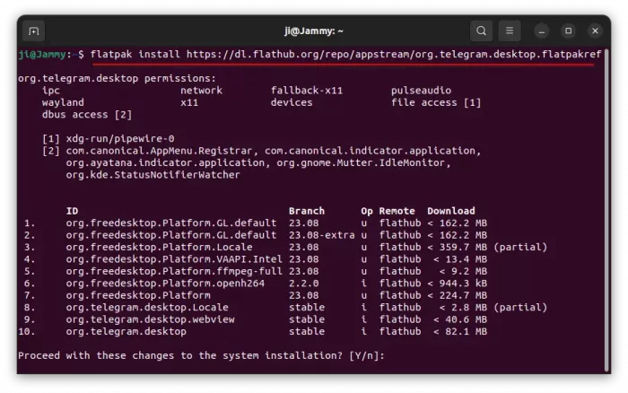 - Then, install Telegram Messenger as Flatpak by running command:flatpak install https://dl.flathub.org/repo/appstream/org.telegram.desktop.flatpakref