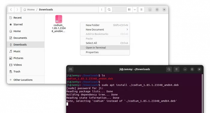 After downloaded the .deb package, right-click on blank area of the Downloads folder and select “Open in Terminal“. Finally, run command to install the package in pop-up terminal window: