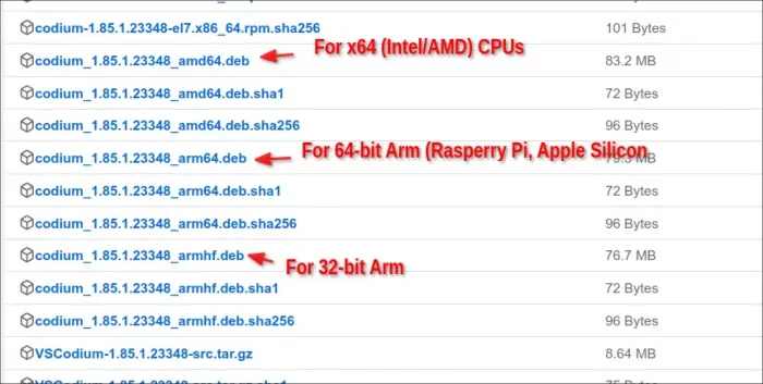For VSCodium insider, go to this page instead. It provides the packages (under “Assets”) amd64.deb (x86_64) for Intel/AMD CPUs, arm64.deb for 64-bit ARM (e.g., Apple Silicon and Raspberry Pi), and armhf.deb for 32-bit ARM devices.