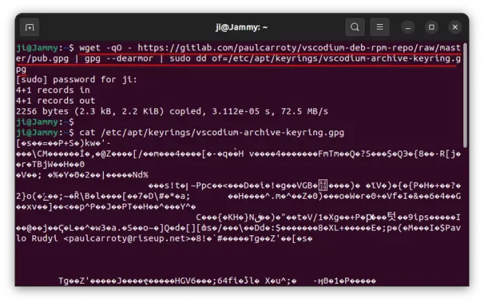 Then, you may verify by cat /etc/apt/keyrings/vscodium-archive-keyring.gpg. It should output un-readable text.