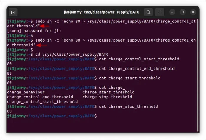 sudo sh -c "echo 88 > /sys/class/power_supply/BAT0/charge_control_end_threshold"