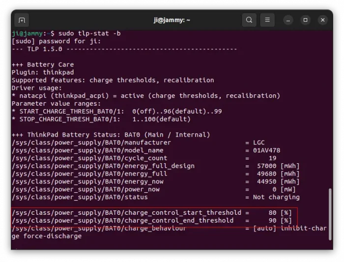 3. To verify if the setting applied, run sudo tlp-stat -b to check.