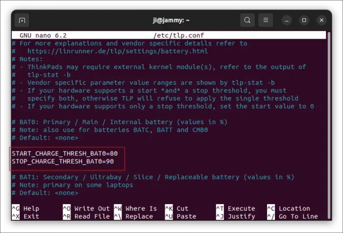 Here replace BAT0 according to step 1, and change number 90 as you want. Finally, press ctrs+s to save file, and ctrl+x to exit.