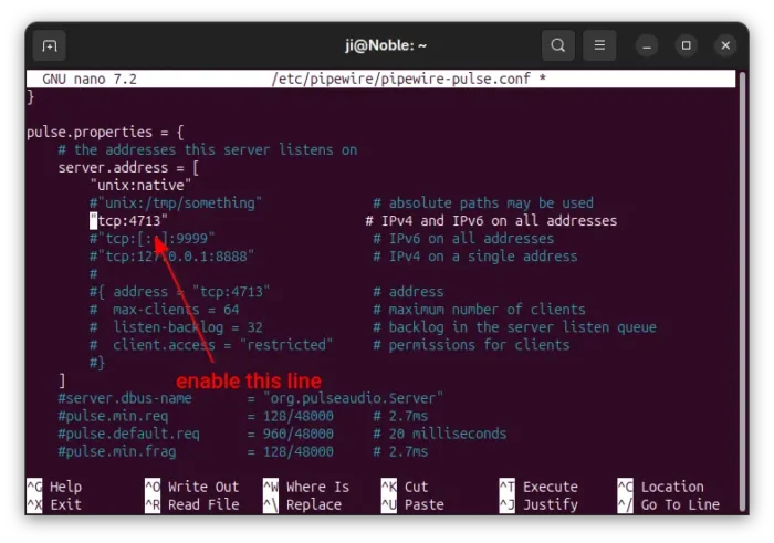 2. Enable listening on TCP. When file opens, scroll down and find out “pulse.properties” section, then enable the “tcp:4713” (remove # at the beginning) line.