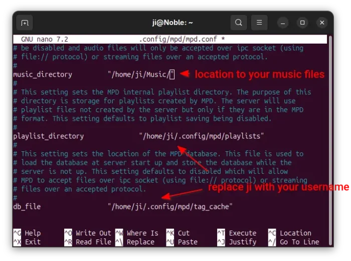 music_directory "/home/ji/Music/" playlist_directory "/home/ji/.config/mpd/playlists" db_file "/home/ji/.config/mpd/tag_cache"
