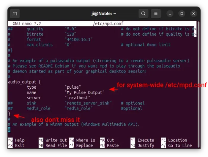 - For system-wide config (/etc/mpd.conf), enable “pulse” instead as pipewire won’t work: