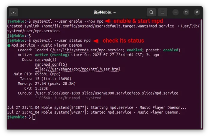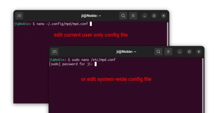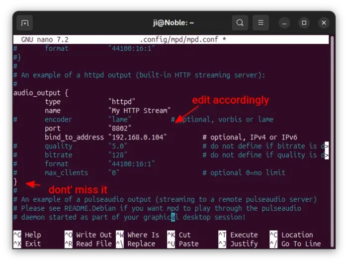 For any error, you may re-run the nano (with -l flag to show line number) command in Step 2 to edit the config file again. And, restart MPD service to reload changes: