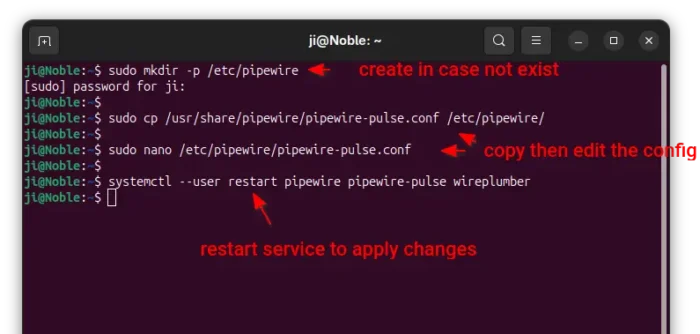 sudo mkdir -p /etc/pipewire sudo cp /usr/share/pipewire/pipewire-pulse.conf /etc/pipewire/ sudo nano /etc/pipewire/pipewire-pulse.conf