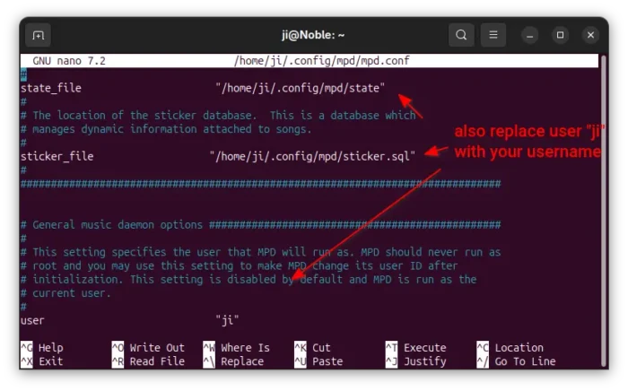 - Next, edit the location of server state and sticker database, and who to run the MPD daemon: