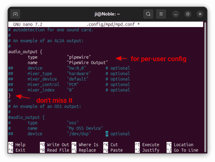 - For per-user configuration (.config/mpd/mpd.conf), set audio output to “pipewire”: