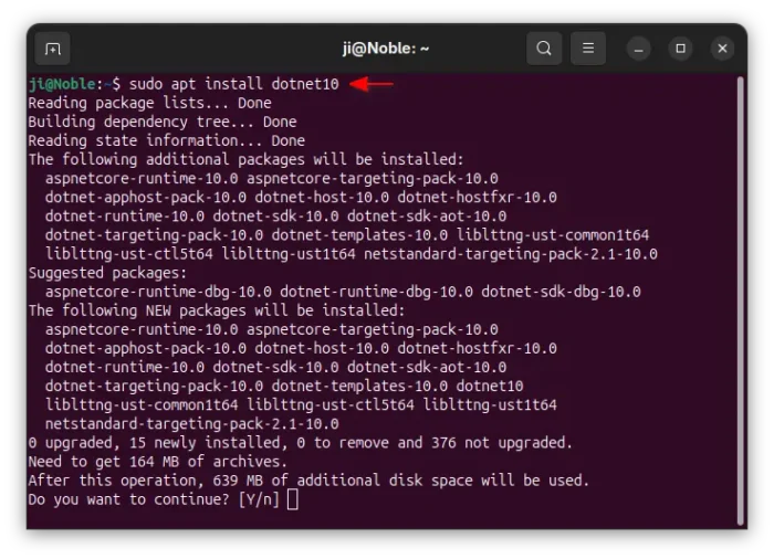 This command will install both the SDK and run-times, while you may replace dotnet10 with dotnet-sdk-10.0, aspnetcore-runtime-10.0, or dotnet-runtime-10.0 to install only the sdk or runtime as you prefer.