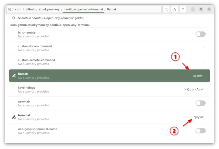 Then, navigate to “com/github/stunkymonkey/nautilus-open-any-terminal”, and disable default values and set: