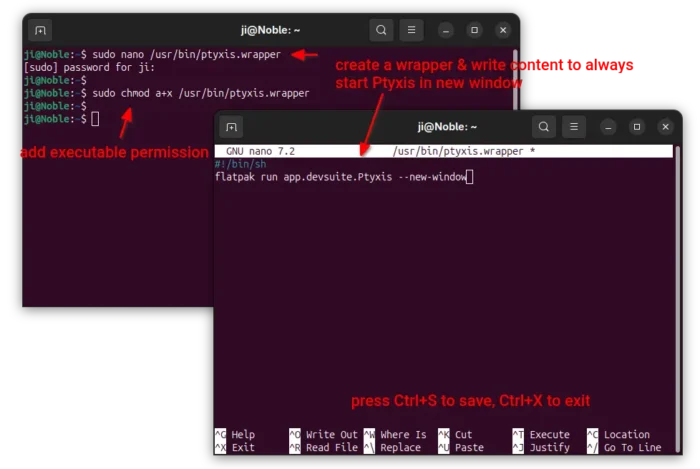 This command will create a script ptyxis.wrapper under /usr/bin with nano command line text editor.