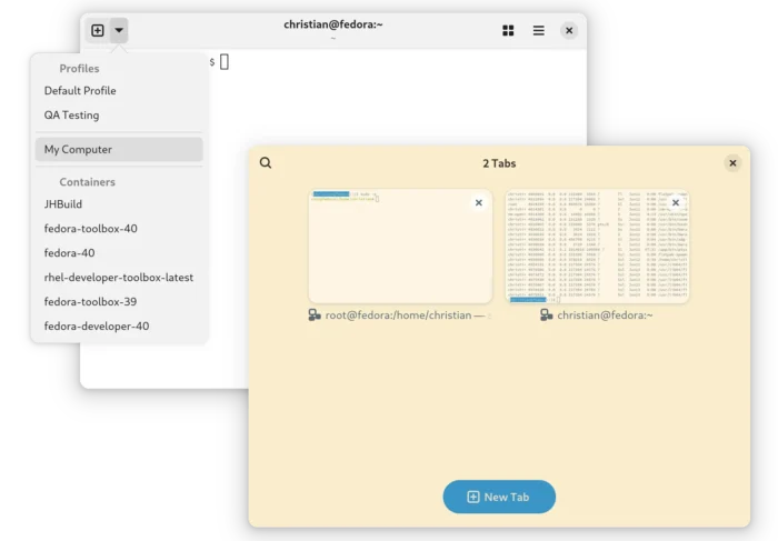 Ptyxis is a modern terminal emulator designed for GNOME with first-class container integration, such as auto-discovery and option to launch a container in new tab, preferences profiles with container integration for Podman, Toolbox, Distrobox, and JHBuild.