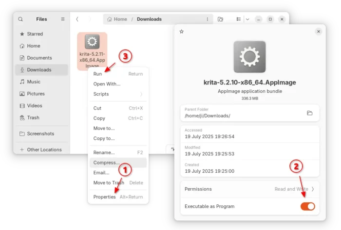For Linux, it’s non-install AppImage that can be run directly to launch the graphics editor, though you need to enable executable permission first from its properties dialog.