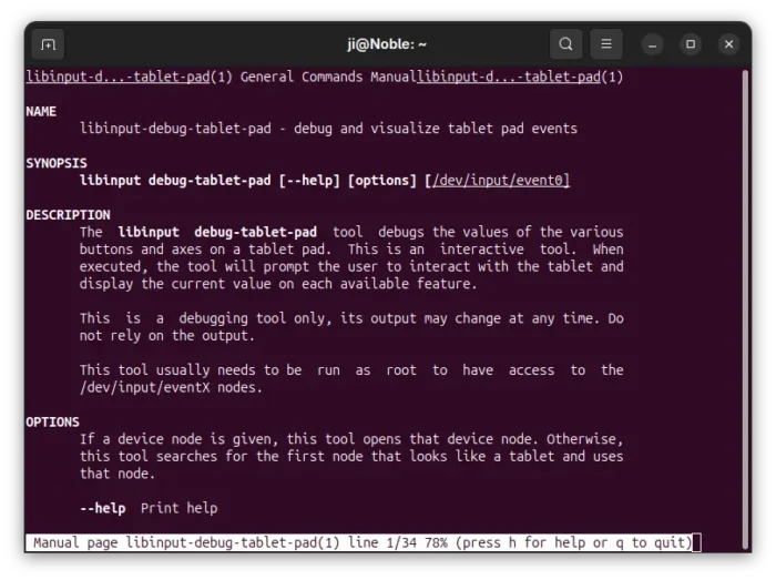 The new release of the library introduced new libinput debug-tablet-pad command line tool. As you see in the screenshot above, it shows an interactive interface showing the values when you press on buttons or rotate the screen. This is useful for debugging, scripting, or even remapping purpose.