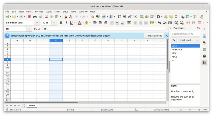 The Calc app now has a new “Column/Row Highlighting” option under Tools -> Options -> LibreOffice Calc -> View. The Functions sidebar deck now includes a search field. Scientific format now supports and saves to ODF. And, shortcuts to switch sheets now work to cycle from last to first and vice versa.