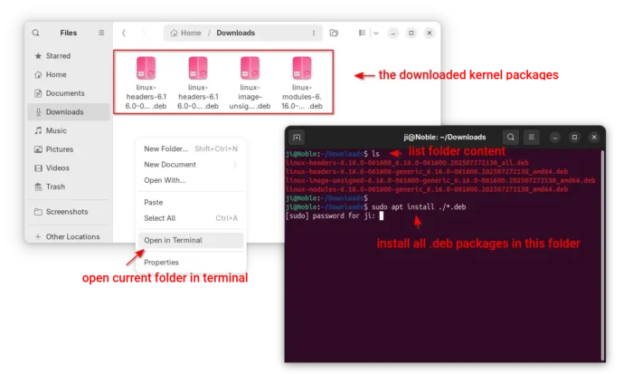 For Ubuntu Desktop or Server on AMD/Intel platform, you may open terminal (Ctrl+Alt+T) and run the 4 commands below one by one to download & install the kernel packages:
