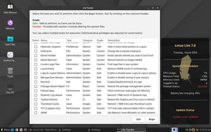 And it includes a “Lite Tweak” tool to do common tasks with few clicks, such as clear memory, install/remove Kernels, boot repair, save battery life with TLP, more efficient memory usage with zRAM, and more.