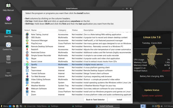 The Control Panel (aka Settings) includes some useful tools to easily configure the desktop. They include scaling factor setting for HiDPI monitor, a desktop widget to monitor CPU and Memory usage, “Lite Software” to install/uninstall popular apps with few clicks, such as Spotify, TeamViewer, Zoom, and more.