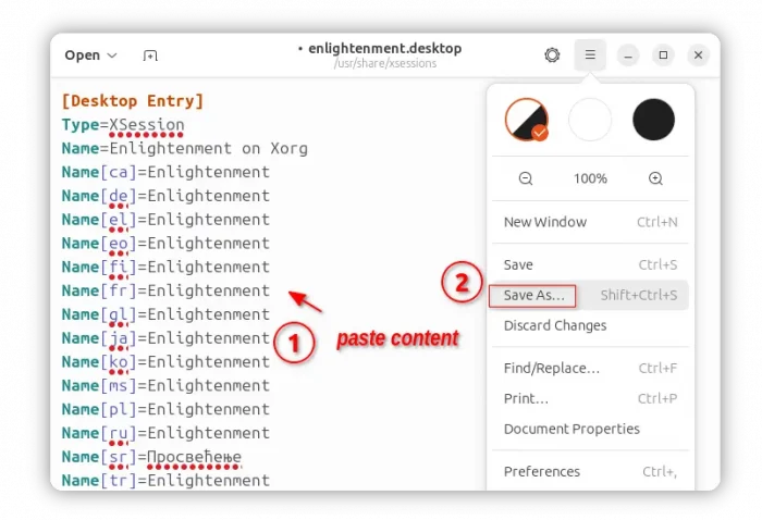 Then, create new empty document (if it does not open one), and paste following lines into it (the content below is copied from /usr/share/xsessions/enlightenment.desktop file):