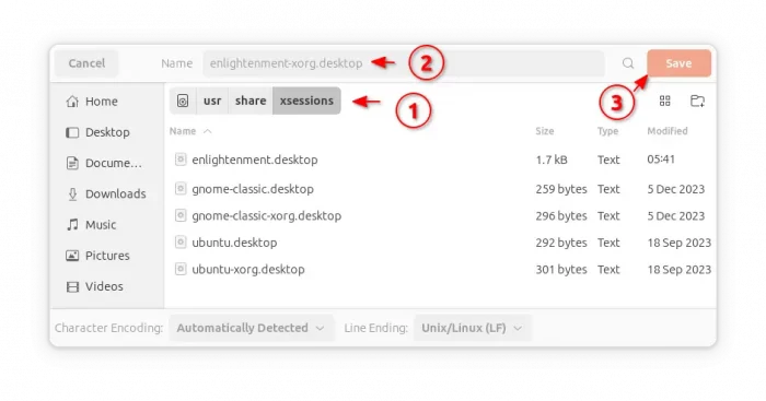 In the pop-up “Save As” dialog, name to file to enlightenment-xorg.desktop and save it to /usr/share/xsessions/ directory, finally click Save.