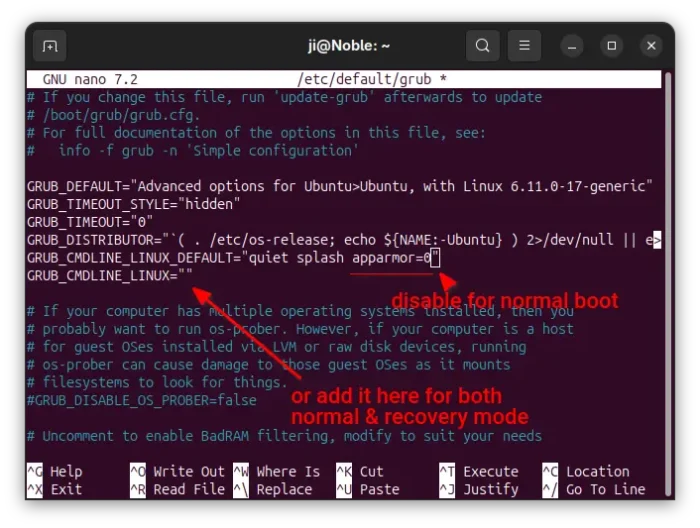 2. When file opens in terminal, add apparmor=0 as value to either ‘GRUB_CMDLINE_LINUX_DEFAULT’ or ‘GRUB_CMDLINE_LINUX’ section.