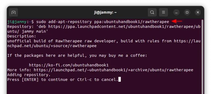 sudo add-apt-repository ppa:ubuntuhandbook1/rawtherapee