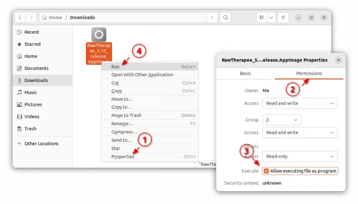 For Linux, it’s an non-install AppImage package. Just download it, add executable permission from file ‘Properties’ dialog, then you may click run the package to launch the software.