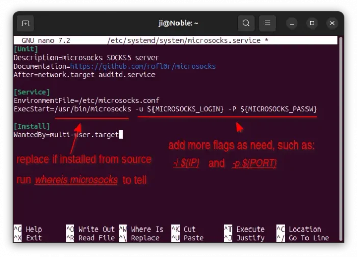 2. Next, create the /etc/microsocks.conf config file and edit with nano: