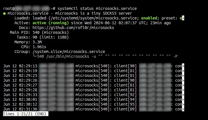 NOTE: If you installed the proxy server from source, then replace /usr/bin/microsocks with /usr/local/bin/microsocks in lines above, and add more flags, such as -1, -p ${PORT} as need.