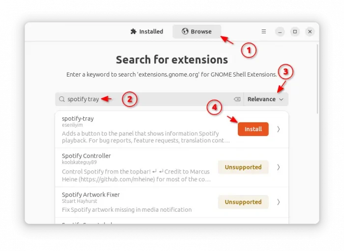 Then, you may use “Extension Manager” to search & install spotify tray extension under Browse tab. For Ubuntu 22.04, switch filter if it does not show you the correct search result.