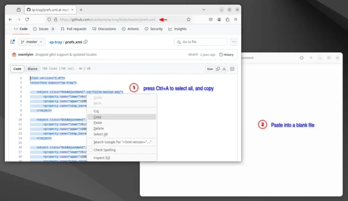 • First, go to the project file page github.com/esenliyim/sp-tray/blob/master/prefs.xml, press Ctrl+A to select all and copy the file content.