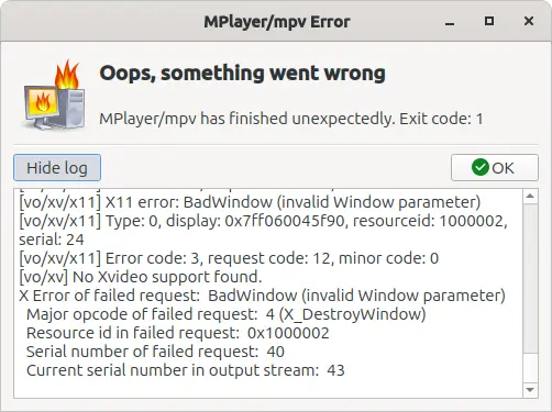 “Oops, something went wrong. MPlayer/mpv has finished uxexpectedly. Exit code: 1”