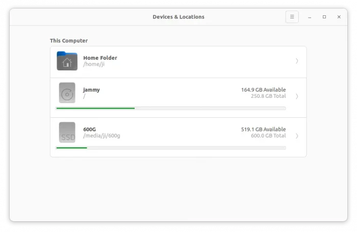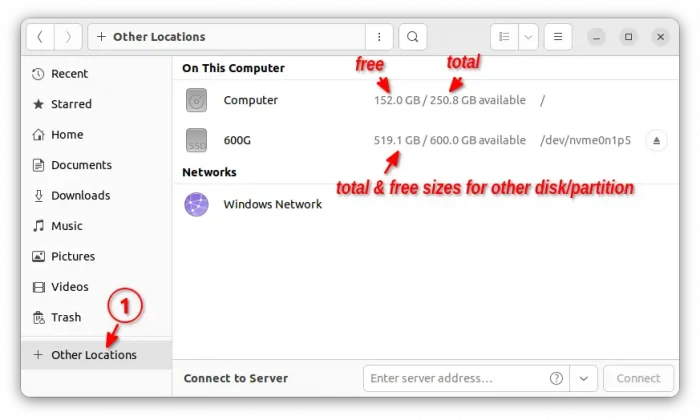 Method 2: For choice, navigate to the Other Locations. Then check the volume available at /. It also shows the free and total sizes of all other mount-able disk volumes.