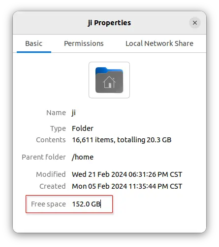Method 1: Most file manager displays the free space in Properties dialog. Simply, right-click on empty area in file manager and select Properties.