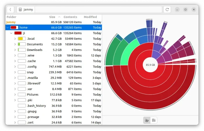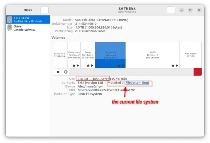 Method 4: GNOME also has a Disk Usage Analyzer tool available out-of-the-box. With it, you can see the free space and total size of both system (/) and other volumes.