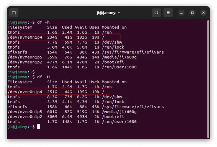 The command above printer sizes in powers of 1024. You may use -H flag instead to use powers of 1000, hence the output numbers are bigger.