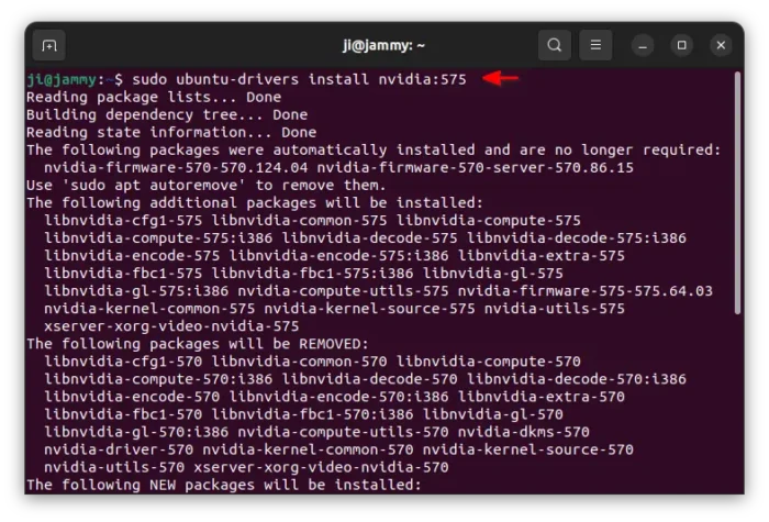- Then, select install a driver, e.g., nvidia 575 for desktop or gaming, by running command: