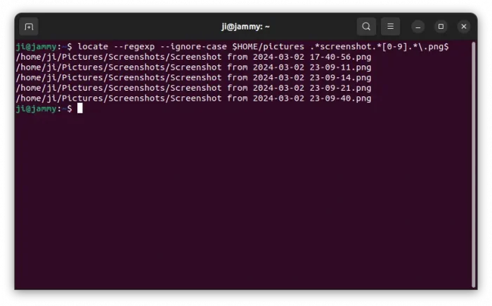 locate --regexp --ignore-case $HOME/pictures .*screenshot.*[0-9].*\.png$
