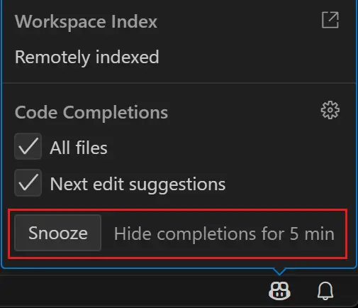 VS Code 1.102 introduced new Snooze feature allowing to temporarily pause inline suggestions and next edit suggestions (NES).