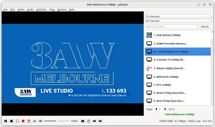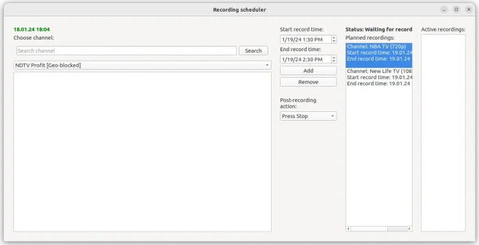 It uses mpv for video playback, and provides record button, to either record current playback, or record certain channels in user given time period. So you won’t miss your favorite TV shows, since they are saved as local videos in your system.
